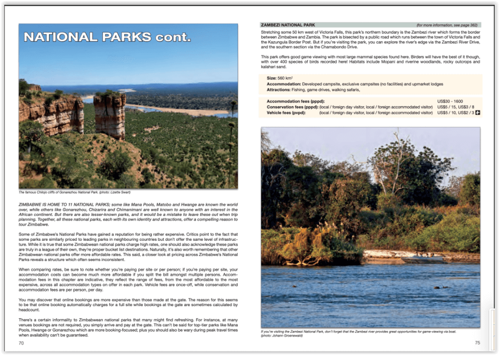 * Detailed Destinations: All destinations in Zimbabwe are described in detail, including available facilities, services, and activities.