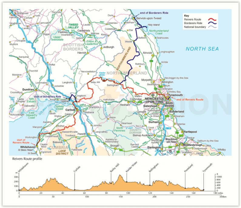Engelse omschrijving: As the wildest of the northern coast-to-coast cycle routes, the Reivers Route explores the rich Border Reiving history of northern England and the Scottish Borders. Travelling 173 mile (280km) from Whitehaven to Tynemouth, this four-day cycle tour takes in the Cumbrian coast, northern Lake District, Northumberland National Park and North Tynedale, offering memorable off-road cycling through Kershope Forest and around Kielder Water. The route offers both on and off-road cycling, and is suitable for cyclists using touring or hybrid bikes. Places to stay overnight include Carlisle, Bailey Mill and Bellingham.