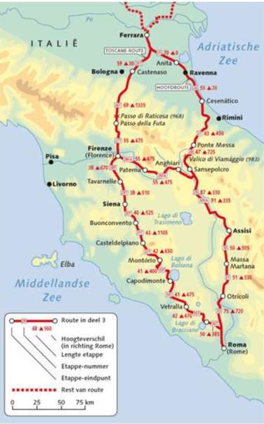 De hoofdroute, via Ravenna met zijn vroeg-christelijke mozaieken en Assisi, de stad van Fransiscus, is de kortste en lichtste. De Toscane-route, via Florence en Siena en de grote katermeren van Bolsena en Bracciano, is zonder twijfel de mooiste, maar al die prachtige uitzichten betekenen wel dat u twee keer zoveel moet klimmen. De derde route verbindt Florence met Assisi en houdt qua schoonheid en zwaarte het midden tussen de beide andere routes.