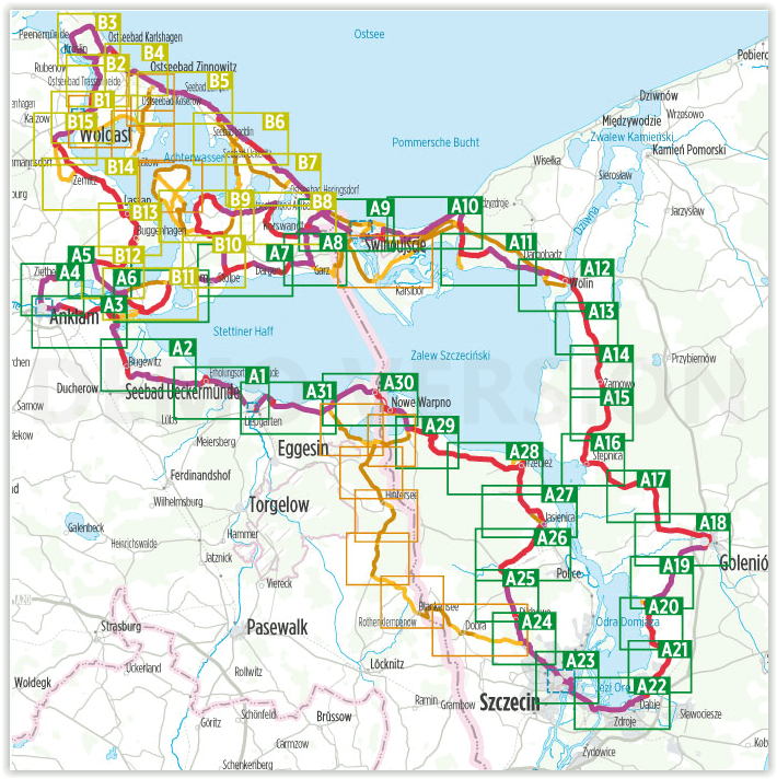 Fietskaart - Usedom & Stettiner Haff Productomschrijving: Usedom (Pools Uznam) is een eiland in de Oostzee voor het Oderhaf. Het grootste deel behoort tot de Duitse deelstaat Mecklenburg-Voor-Pommeren. Usedom wordt in het westen door de Peenestrom, in het oosten door de rivier ?wina en in het noorden door de Oostzee (Pommerse Bocht) begrensd. De regio's is de laatse jaren bekender geworden…