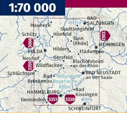 Over de regio: Fiets door pittoreske stadjes zoals Fulda, bekend om zijn barokke oude binnenstad, en geniet van het uitzicht vanaf de Wasserkuppe, het hoogste punt in het Rhöngebergte. Ontdek de idyllische hoogveengebieden en de heldere rivieren Ulster en Haune. Deze regio biedt een perfecte mix van natuur en cultuur.Fietskaart