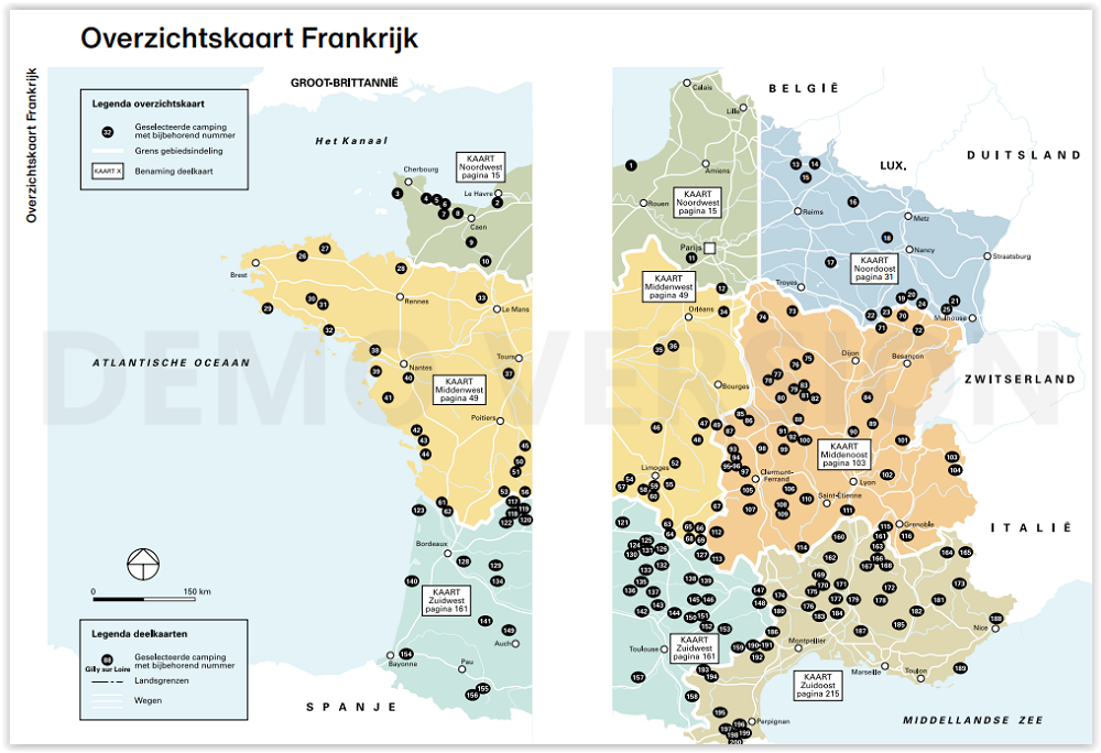 De prachtige en veelzijdige natuur gecombineerd met de rijke cultuur, het lekkere eten en het goede klimaat maakt dit land tot een perfect kampeerland. Van de witte krijtrotsen in het noorden tot de lavendelvelden in de Provence en van de bergweiden in de Alpen tot de wijnvelden in de Bordeaux, overal is wel een prachtig gelegen, natuurlijk terrein gevonden. Hiertussen zitten weer veel nieuwe campings. Hierbij is gebruik gemaakt van duidelijke selectiecriteria met de nadruk op: rust, ruimte, omgeving, ontvangst, kleinschaligheid en sfeer.