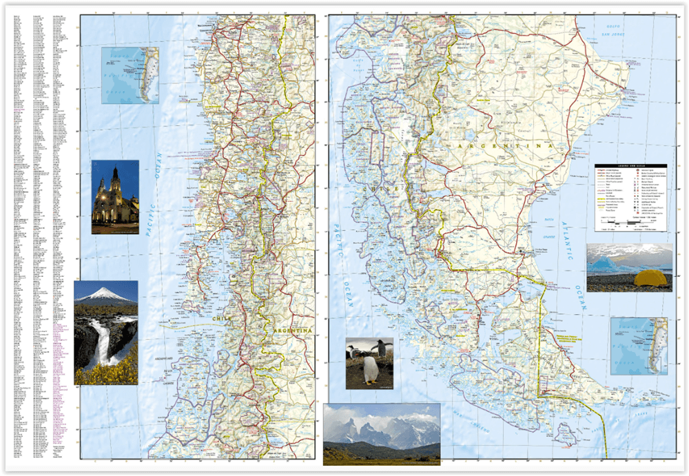 The map conveniently covers the country in four sections: from its northern borders with Peru and Bolivia to the city of Copiapo; the next section continues south, through the capital of Santiago, to Concepcion; then into Patagonia and the city of Coihaique, the Chonos Archipelago and Moraleda Channel; finally to the southernmost part of the country with its National Parks and Preserves, including Alberto de Agostini National Park. The long border with Argentia is shown with border crossings. Inset maps cover Easter Island and the Juan Fernandez Islands. This unique map, with its abundance of specialized content. compliments any guidebook.