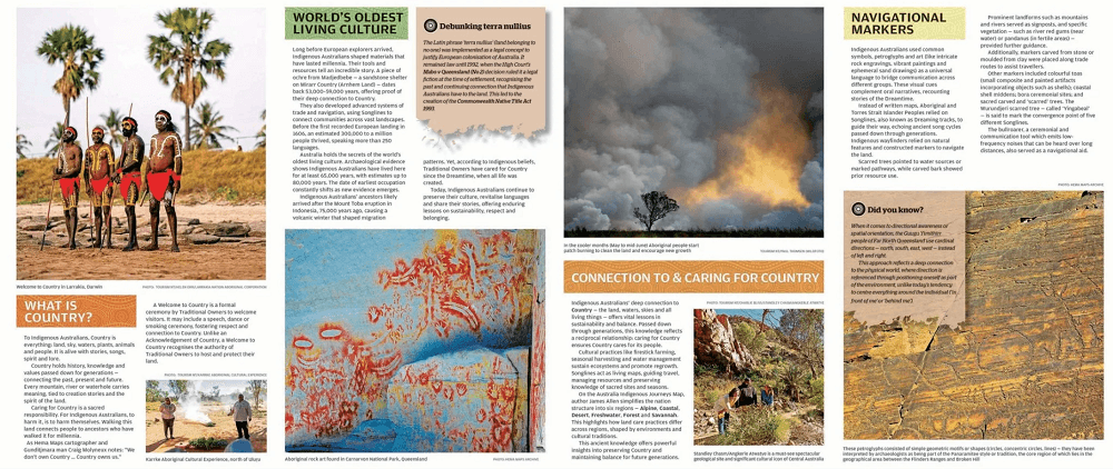 Al meer dan 65.000 jaar bewandelen Aboriginals en Torres Strait Islanders - de traditionele eigenaars van Australië - het land, smeden handelsroutes, delen kennis en zorgen voor het land. De Indigenous Journeys Map eert deze blijvende banden met het land door middel van een gedetailleerde, respectvolle en unieke weergave van oude handelsroutes, culturele paden en zanglijnen.