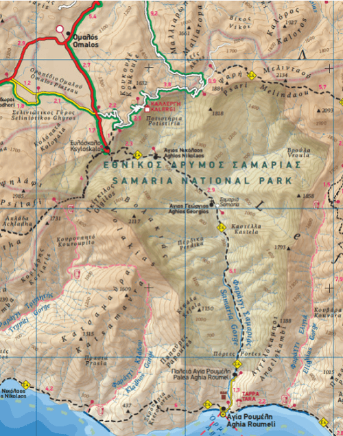 For the first time in a map of Crete, the bolted canyoning routes and the climbing crags of the area are included. Moreover, suggested scenic routes are marked with a green shadow on the map. Also, a full index of the place names and the archaeological sites is included, as well as a detailed townplan of Chania in the scale of 1:4.500.