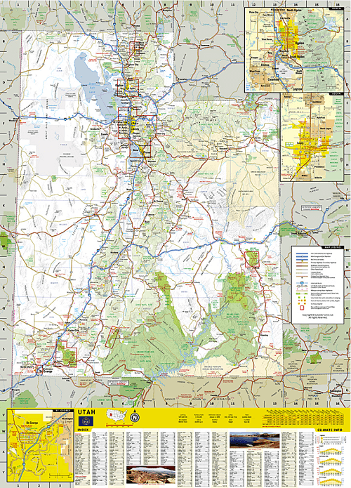 Inset maps of Ogden, Logan, Salt Lake City, Provo provide additional detail of these popular cities. While inset maps and travel information are given for Utah 12 Scenic Byway and Zion, Arches and Bryce Canyon National Parks. An overview of popular points of interest, a calendar of events and a national park service chart are all provided along with relevant contact information.