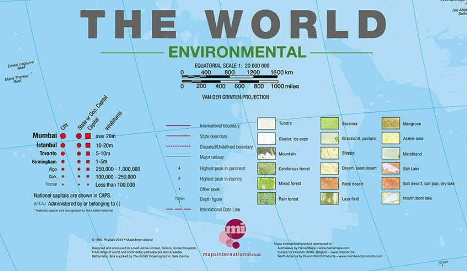 Productomschrijving: Een fantastische weergave van de bodembedekking in de wereld. Duidelijke indicaties van verschillende milieucategorieën: toendra, bossen, woestijnen, enz. Een geweldig middelpunt in elk klaslokaal of kantoor.