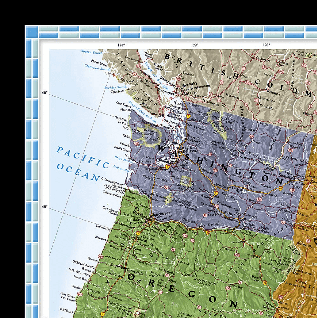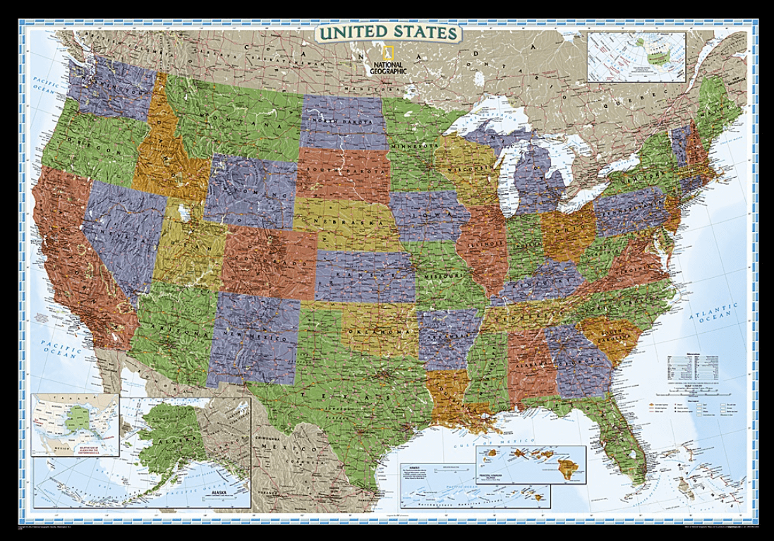 Productomschrijving: National Geographic's Decorator style map of the United States features rich, attractive color fills that bring any room or classroom to life. The map clearly highlights the differences in the urban and physical geography of each state, and national parks are outlined with eye-catching green vignettes. All 50 States are featured including insets for Alaska and the Hawaiian Islands. An inset demonstrating the relative size of Alaska is shown as well. All major cities, transportation routes, State boundaries, inland waterways, and mountain ranges are clearly displayed and labeled.