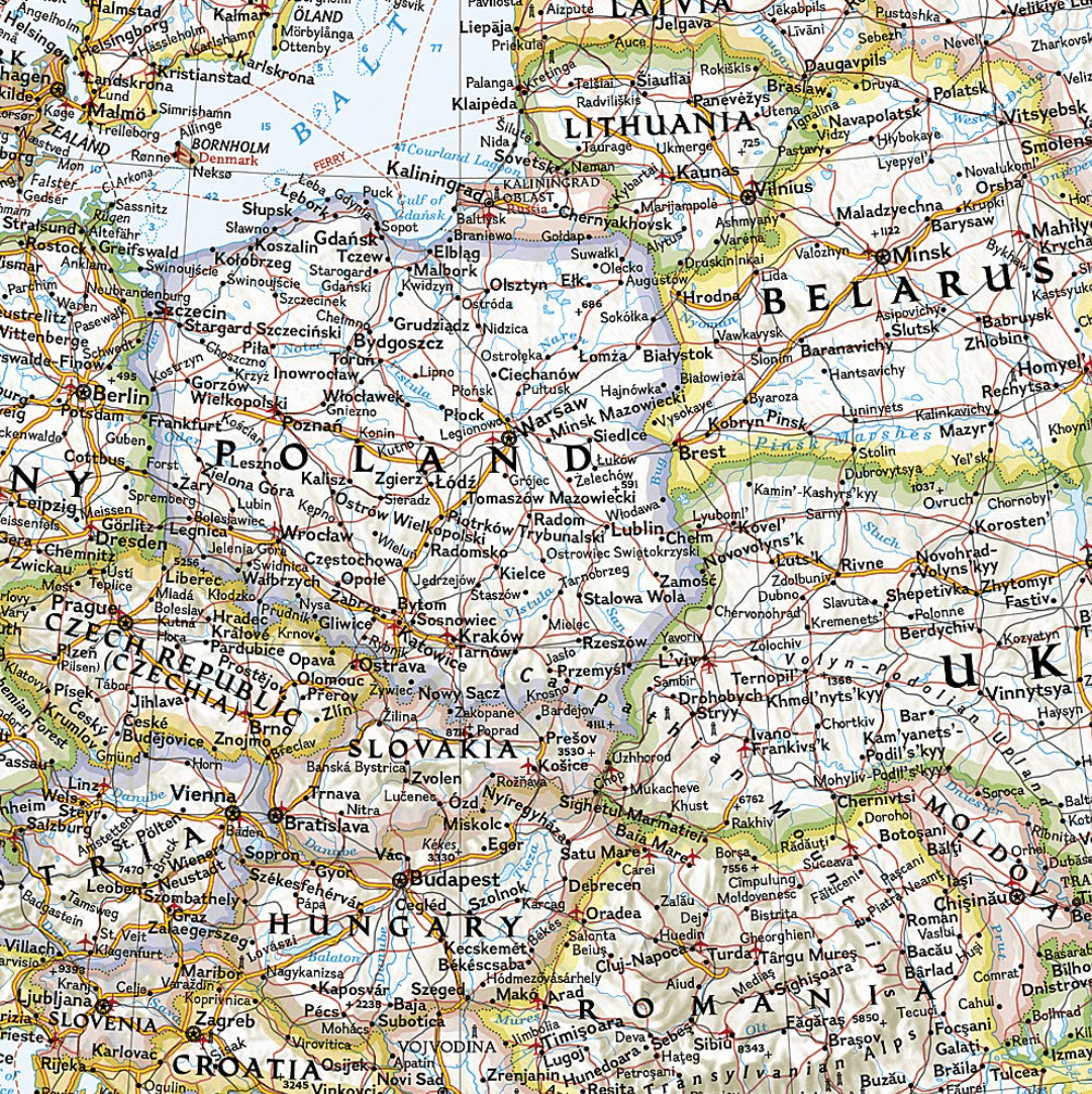 Productomschrijving: National Geographic's Classic political map of Europe features clearly defined international boundaries, thousands of place names, waterbodies, airports, major highways and roads, national parks, and much more. The tasteful color palette, shaded relief, and coastal bathymetry make this map as attractive as it is functional.