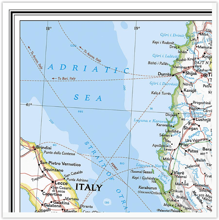 Coverage includes: mainland Greece along with areas of bordering Albania, Macedonia, Bulgaria and Turkey. Surrounding waterways, like the Aegean and Ionian Seas are shown with depth curves and soundings along with hundreds of islands, including Crete, Rhodes and Euboea. Also shown are thousands of place names, accurate boundaries, national parks, ruins and major infrastructure networks such as roads, highways, airports, railroads, canals and ferry routes.