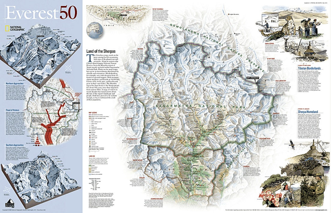 The work of generations of surveyors—stretching back to the days of George Everest himself—undergirds like bedrock this most detailed digital model of Mount Everest. The reverse side shows a map of Sagarmatha National Park and surrounding areas. Inset maps and informative sidebars describe the Sherpas, special locations in the area, the growth in visitors to the region, and the routes taken by famous Everest expeditions.