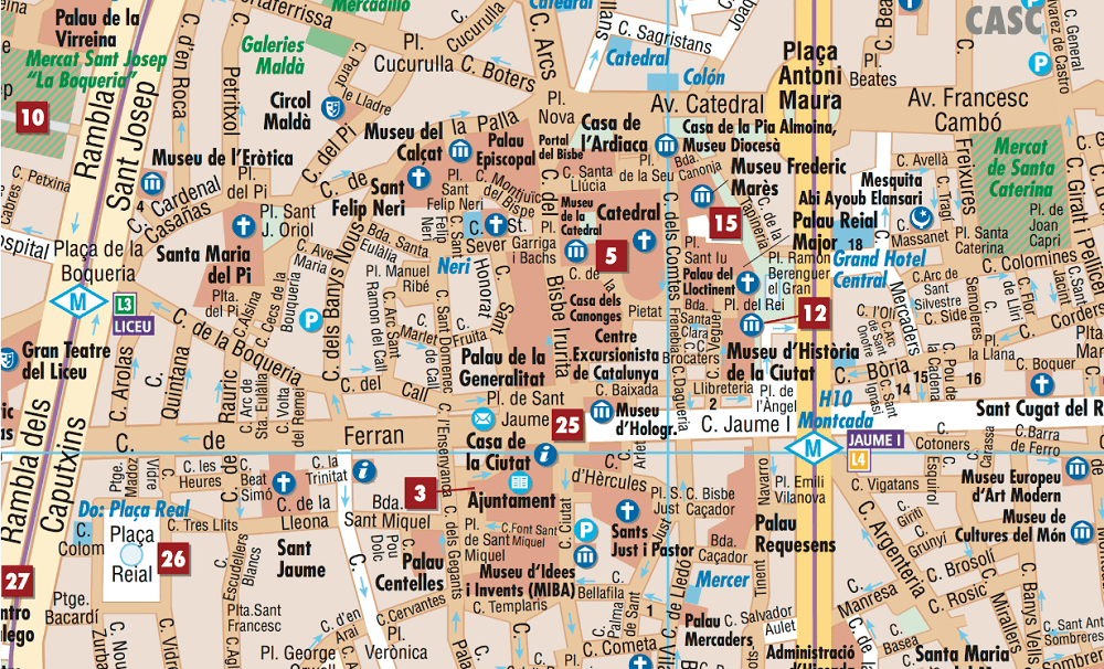 Productomschrijving: Our soft-laminated folded map of Barcelona in the 14th edition shows: Barcelona Centre 1:11 000, Royal Palace 1: 11 000, Parc Güell 1:11 000, Old Town 1:5 500, Barcelona and Region 1:150 000, Public Transport Barcelona, Top 30 Sights and Spain administrative. Borch maps are easy to fold, durable and water-repellent with a wipeable surface. Borch Maps show hotels, museums, monuments, markets, top sights and points of interest, useful statistics, conversion charts for temperatures, weights and measurements, climate charts showing temperatures, sunshine hours, precipitation and humidity, overview maps, time zones, and much more...