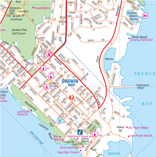 Stadskaart Darwin & omgeving - Hema Productomschrijving: Darwin CBD, City & Suburbs Map A map that has Darwin city (1:25,000) and suburbs on one side and maps of Palmerston (1:25,000), ...