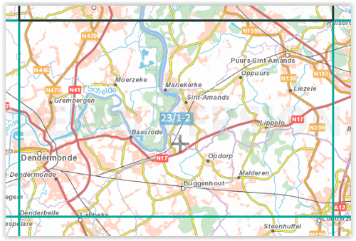 De kaart omvat eveneens: Puurs-Sint-Amands, Oppuurs, Moerzeke, Mariekerke, Sint-Amands, Liezele, Lippelo, Grimbergen, Baasrode, Dendermonde, Opdorp, Malderen & Buggenhout.