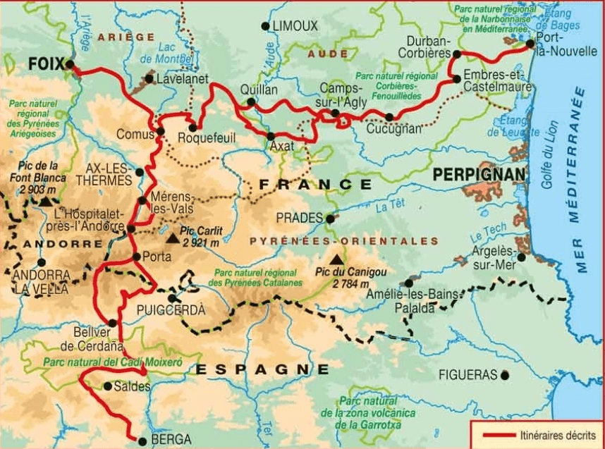 Productomschrijving: 2 verschillende routes, de Sentier Cathare (13 dagen) en de Chemin des Bonshommes (13 dagen), voor meer dan 25 dagen rondtrekken in de voetsporen van de Katharen, tussen geschiedenis, erfgoed en de bergen van de Pyreneeën. Het Katharenpad neemt je mee van de Middellandse Zee naar het balkon van de Pyreneeën, door lagunes, garrigue en rotsachtige bergkammen.