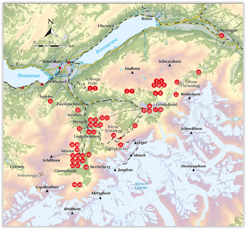 Views of the Bernese Alps, the Jungfrau, Eiger, Mönch and others; walks to the Schreckhorn and Rottal huts; Schynige Platte to First; Trümmelbach Falls.