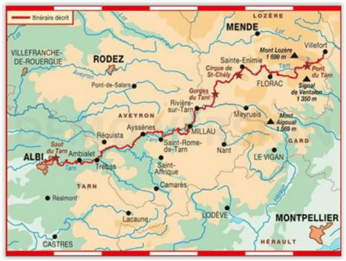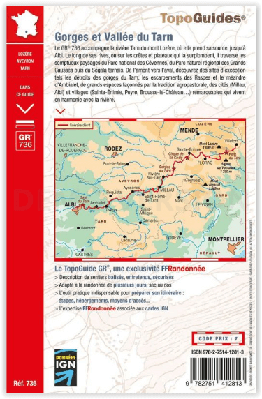 Franse omschrijving: Le Tarn prend naissance au mont Lozère, sommet des Cévennes, et chemine jusqu’à Saint-Nicolas-de-la-Grave où il se jette dans la Garonne. Le GR® 736 accompagne son cours à la découverte de majestueux canyons, ponts d’architecture remarquable (viaduc de Millau), villages pittoresques (Peyre), en passant par les reliefs boisés des Cévennes et les vastes plateaux des Grands Causses. L'itinérance se termine à Albi, ville de patrimoine aux tons rose ou ocre selon la lumière.