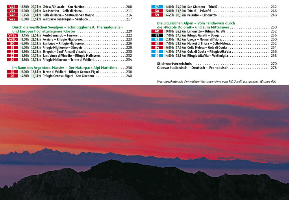 Die GTA wurde im Jahr 1979 ins Leben gerufen, um dem teils dramatischen Einwohnerrückgang in diesem abgelegenen Teil Piemonts entgegenzuwirken – ein gelungener Versuch, mit sanftem Tourismus einen Anreiz zum Bleiben zu schaffen. Mit einer Strecke von rund 900 Kilometern und 65.000 Höhenmetern, aufgeteilt auf 65 Etappen, ist sie ein echtes Highlight für Weitwanderer, aber auch eine Herausforderung. Daher untergliedert der Rother Wanderführer die Gesamtstrecke in praktische Wochenabschnitte, deren Ausgangs- und Endpunkte leicht mit öffentlichen Verkehrsmitteln zu erreichen sind.
