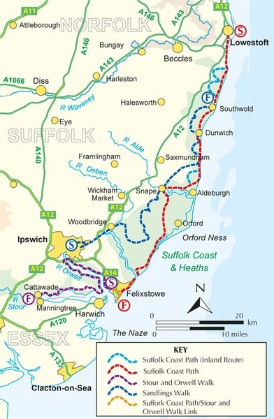 Product description: The three long-distance walks described in this book - the Suffolk Coast Path, the Stour and Orwell Walk and the Sandlings Walk - link together to provide a comprehensive and varied circuit of the entire Suffolk Heritage Coast. The Suffolk Coast Path stretches along the coast between Lowestoft and Landguard Fort, close to Felixstowe in the south, a total distance of 60 miles (97km) depending on whether beach walking or inland options are followed.