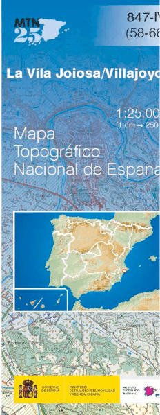 Wandelkaarten Villajoyosa (gemeente) Alicante, Valencia Spanje en Alicante (provincie) Valencia Spanje van Centro Nacional de Informacion Geografica. Ideaal voor tochten in Spanje.
