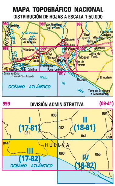 Wandelkaarten El Rompido (gemeente) Huelva, Andalusië Spanje en Huelva (gemeente) Huelva, Andalusië Spanje van Centro Nacional de Informacion Geografica. Ideaal voor tochten in Spanje.