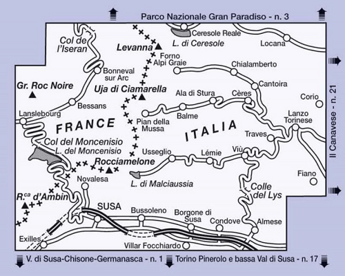 Omvat: Val di Viu, Val d'Ala di Stura, Val Grande, Susa, Condove, Lémie, Balme, Corio, Fiano, Traves, Locana, Bessans, Novalesa, Bussoleno, Viù, Exilles, Levanne, Colle del Lys, Col del Moncenisio, Col de l'Iseran, Piano della Mussa, Grand Roc Noir, Roca d'Ambin, Levanna, Uja di Ciamarella, Rocciamelone, Lago di Ceresole, Lago del Moncenisio.