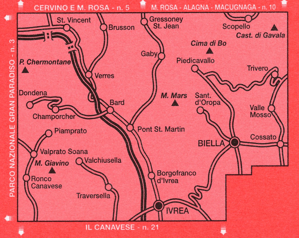 Omvat: Belmonte, Champorcher, Gressoney S.Jean, Oropa, Pont St.Martin, S.Vincent, Valchiusella, Valle Mosso, Verres, Ivrea, Biella, Scopello, Ronco Cavanese, Dondena, Valchiusella, Bard, Brusson, Cossato, Monte Mars, Monte Giavino, Cima di Bo, Monte Barone, Rosa dei Banchi.