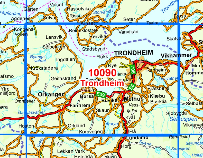 Plaatsnamen op de kaart Trondheim: Byneset, Børsa, Flakk, Flå, Heimdal, Jonsvatnet, Klæbu, Korsvegen, Lensvik, Melhus, Orkanger, Stadsbygd, Trondheim & Vanvikan.