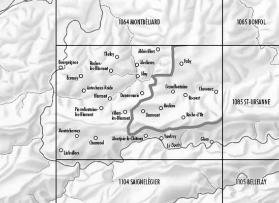 Productomschrijving: Laart 1084 - Hoge alpen regio tussen Villars-les-Blamont en Grandfontaine - Damvant is een plaats en voormalige gemeente in het Zwitserse kanton Jura, en maakt deel uit van het district Porrentruy.