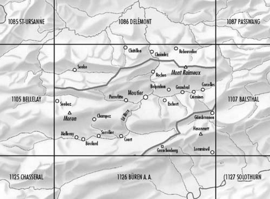 Wandelkaart Moutier - Bern Zwitserland - Swisstopo Productomschrijving: Kaart 1106 - Gelegen aan de voet van het Regionaler Naturpark THAL langs de route E17, en rechts boven het Parc Nature...