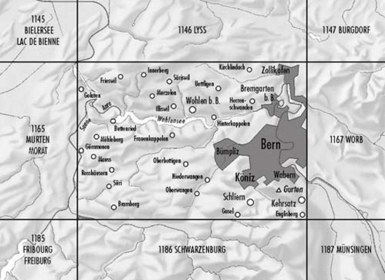 Wandelkaart Bern Zwitserland - Swisstopo Productomschrijving: Kaart 1166 - Stadsomgeving en bijhorende wandelingen - De stad ligt aan de rivier de Aare, oorspronkelijk gebouwd in een bocht v...