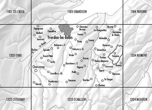 Wandelkaart Yverdon - Vaud Zwitserland - Swisstopo Productomschrijving: Kaart 1203 - Op de Frans Zwitserse grens in het Parc Naturel Régional Jura Vaudois, aan de monsing van de Lac de Neuch...