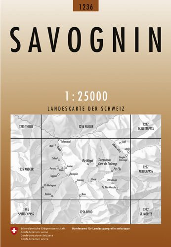 Wandelkaart Savognin - Graubunden Zwitserland - Swisstopo Productomschrijving: Kaart 1236 - Gelegen langs de route 3 met meelopende rivier, in een beboste omgeving aan de voet van Parc Ela, ...