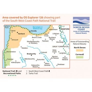 126 / Clovelly & Hartland, Devon, England - Map sheet number 126 in the OS Explorer series covers Clovelly, Bideford, Hartland, Bradworthy and Great Torrington. Highlights of the area include: North Devon and Cornwall AONB, River Torridge and Tamar, Hartland Point, Barnstaple and Bideford Bay and Coombe. Also includes part of the South West Coast Path. The OS Explorer map for Clovelly & Hartland is available in both the standard paper version and weatherproof 'Active' version.