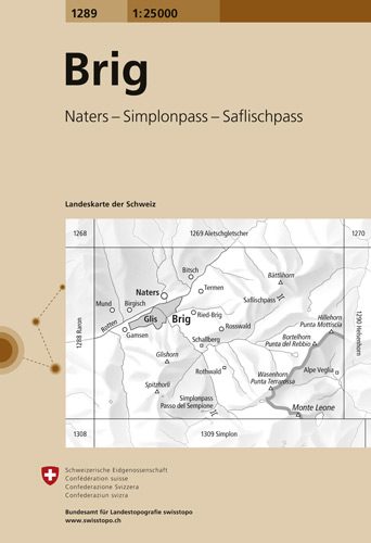 Wandelkaart Brig - Wallis Zwitserland - Swisstopo Productomschrijving: Kaart 1289 - Gelegen tegen het Honegga Forest, op de Zwitserse Franse grens, nabij Landschaftspark Binntal. Detail:...