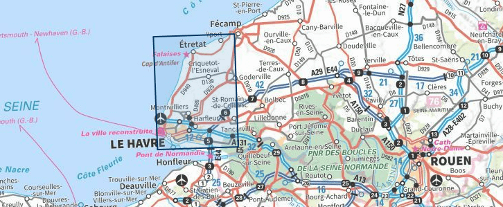Productomschrijving: Deze bevindt zich in de hoek van kustlijn van Frankrijk in Normanië, de kaart omvat het departement van de Seine-Maritimes, en omvat een stuk van het regionaal park (PNR des Boucles Seine Normandie).