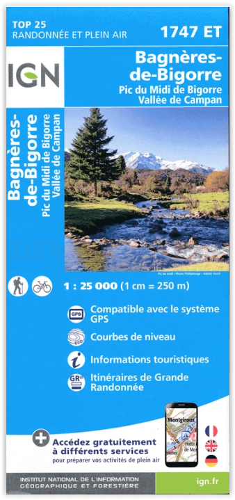 Wandelkaart Bagnères-de-Bigorre - Pic du Midi de Bigorre - IGN Productomschrijving: Bagnères-de-Bigorre is een gemeente in het Franse departement Hautes-Pyrénées, in de regio Occitanie. Pic ...