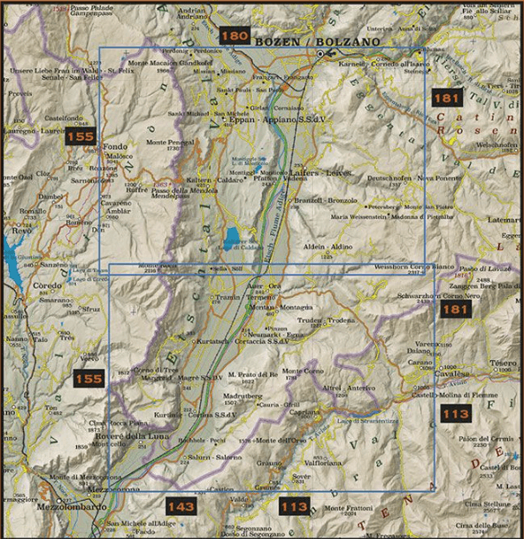 Productomschrijving: De kaart strekt zich uit van Bolzano tot aan de grens met Trentino in het zuiden. We vinden hier de gebieden Caldaro en Appiano, bekend om hun voortreffelijke wijnen, maar ook om hun talrijke forten, kastelen en herenhuizen. Ook het Caldaromeer en de twee meren van Monticolo zijn opgenomen. In het westen ligt de Mendola-bergketen, die het Val di Non scheidt, terwijl we in het oosten het natuurpark Monte Corno vinden.