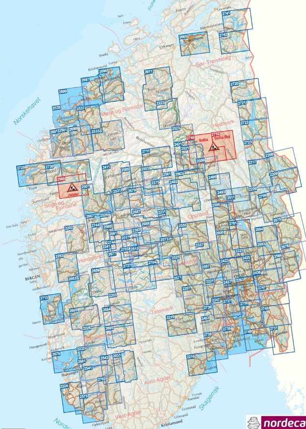 Wandelkaarten Hordaland, Noorwegen, Buskerud, Noorwegen, Telemark, Noorwegen en Hordaland, Noorwegen van Nordeca AS. Ideaal voor tochten in Noorwegen.