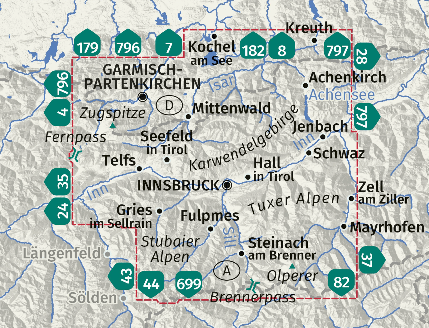 Over de regio: Wonen in Innsbruck is een bevoorrechte plek: direct boven de prachtige hoofdstad van de Oostenrijkse deelstaat Tirol rijzen dichtbeboste middelgebergteplateaus, panoramische lokale bergen en in de verte zelfs glinsterende toppen van 3000 meter hoog op. Het Nordkettegebergte, de Nockspitze, de rustige Patscherkofel - het staat er allemaal op, samen met 1001 andere excursie- en reisbestemmingen. Vier kaartpagina's op schaal 1:50.000 tonen alles wat binnen een straal van enkele kilometers bereikbaar en de moeite waard is om te beleven – van de Swarovski Kristallwelten tot Serles, de "heilige berg" boven het Maria Waldrastklooster.