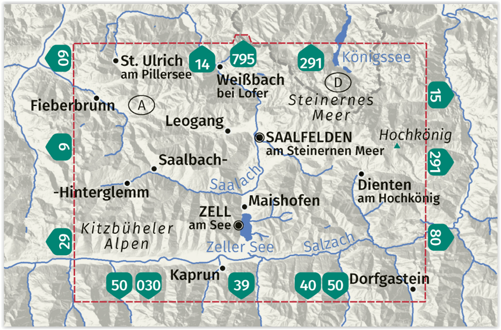 Regio's: Kitzbüheler Alpen, Pinzgau, Salzach, Saalachtal, Berchtesgadener Alpen, Steinernes Meer, Dientener Berge.
