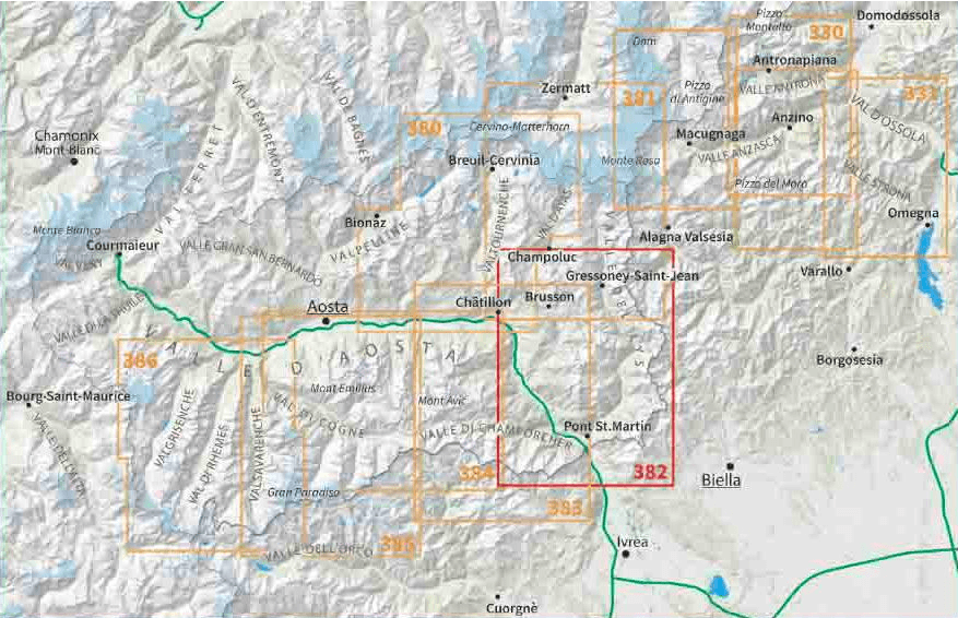 Wandelkaarten Aoste, Italië en Val d'Aoste, Italië van 4Land Cartografia Italia. Ideaal voor tochten in Italië en Zwitserland.