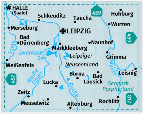 Halle, Schkeuditz, Tauche, Hohburg, Wurzen, Leipzig, Naunhof, Bad Dürrenberg, Markkleeberg, Borna, Bad Lausick, Leisnig, Geopark Porphyrland, Rochlitz, Altenburg, Lucka, Zeitz, Meuselwitz, Weißenfels