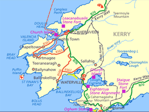 Omvat: Countie Kerry met, Caherciveen, Knights Town, Chapeltown, Portmagee, Teeranearagh, Ballynahow, Ballinskelligs, Waterville & Sallahig.