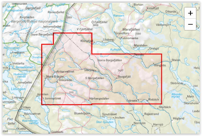 Productomschrijving: Dit is de allereerste bergkaart op een schaal van 1:50.000 van Borgafjäll en zijn omgeving. De kaart beslaat het gebied ten zuiden van Klimpfjäll en Saxnäs in het noorden tot Stora Blåsjön en Risböck in het zuiden.