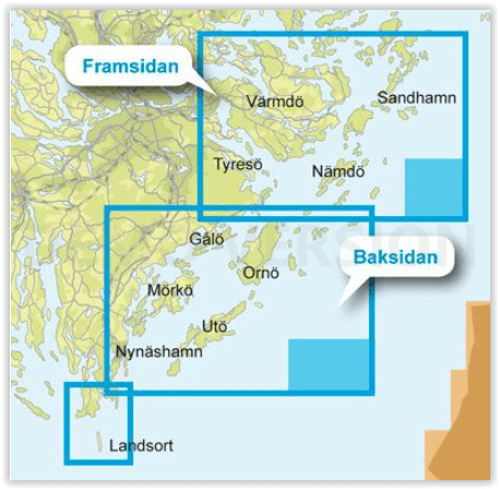 Productomschrijving: Dit is de zuidelijke van onze twee kaarten die de hele archipel van Stockholm bestrijken. De kaart bestrijkt het hele gebied van Vaxholm en Möja in het noorden tot Landsort in het zuiden.
